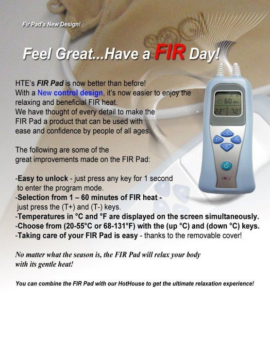 The FIR Pad is ideal for normal aches andpains and is quite nice to use in the living room in front of the TV. The Elderpeople seem to like this item because it is more affordable that the regularhothouse. I don’t think I have to say much about Far Infrared Rays, as wediscussed in thoroughly in chapter 1.